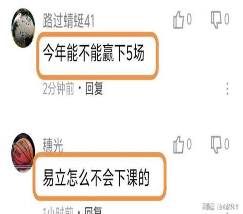 易立率队惨淡的战绩,也被球迷诟病。“江苏队不要脸。易立脸皮厚”;“今年能不能赢下5场”;“易立怎么不会下课的”;“我已经说了很多遍了,江苏有易立在永远不可能崛起”;“易立赶紧下课吧”;“江苏队真的太差了”;“现在的易立成为了新的不倒翁”;“坑爹呀,年年如此”;“没三分球的球队,能赢才怪”;“江苏是教练的问题,还是球员的问题?”……